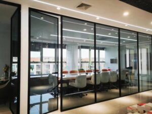Pembuatan sekat ruang pada gedung perkantoran, dengan menyekat ruang menjadi beberapa bagian dengan material alumunium dan kaca, ruangan dirancang dengan luas sesuai dengan bagian didalam perusahaan.